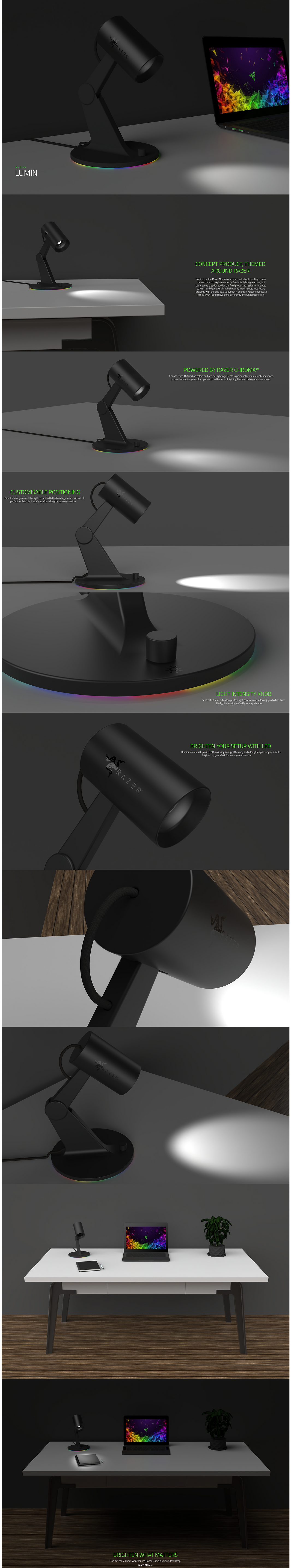 Inspired by the Razer nommo, a speaker from the same brand, I set out in this short project to develop a Razer desk lamp. The aim was to use the uniqueness of the Razer Nommo, paired with its websites promotional page, to create an addition to Razers product portfolio which followed their styling, whilst presenting the end product like Razer would on their website. The Project involved experimentation with keyshots directional lighting and was one of my first intoductions to keyshots labelling feature.